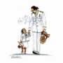 Músico de Tres Caídas de Triana cogido de la mano de una niña, una preciosa lámina realizada con diferentes técnicas de dibujo.