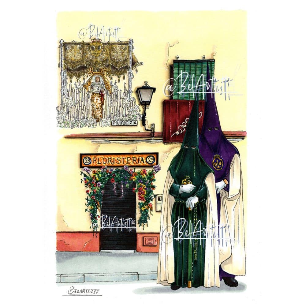 La obra está realizada sobre papel artístico de alta calidad, preparada para que luzca perfecta enmarcada en A5. Una pieza pensada para tu cuarto, tu salón, rincones cofrades o cualquier espacio donde quieras que los nazarenos de Sevilla estén presentes todo el año.
